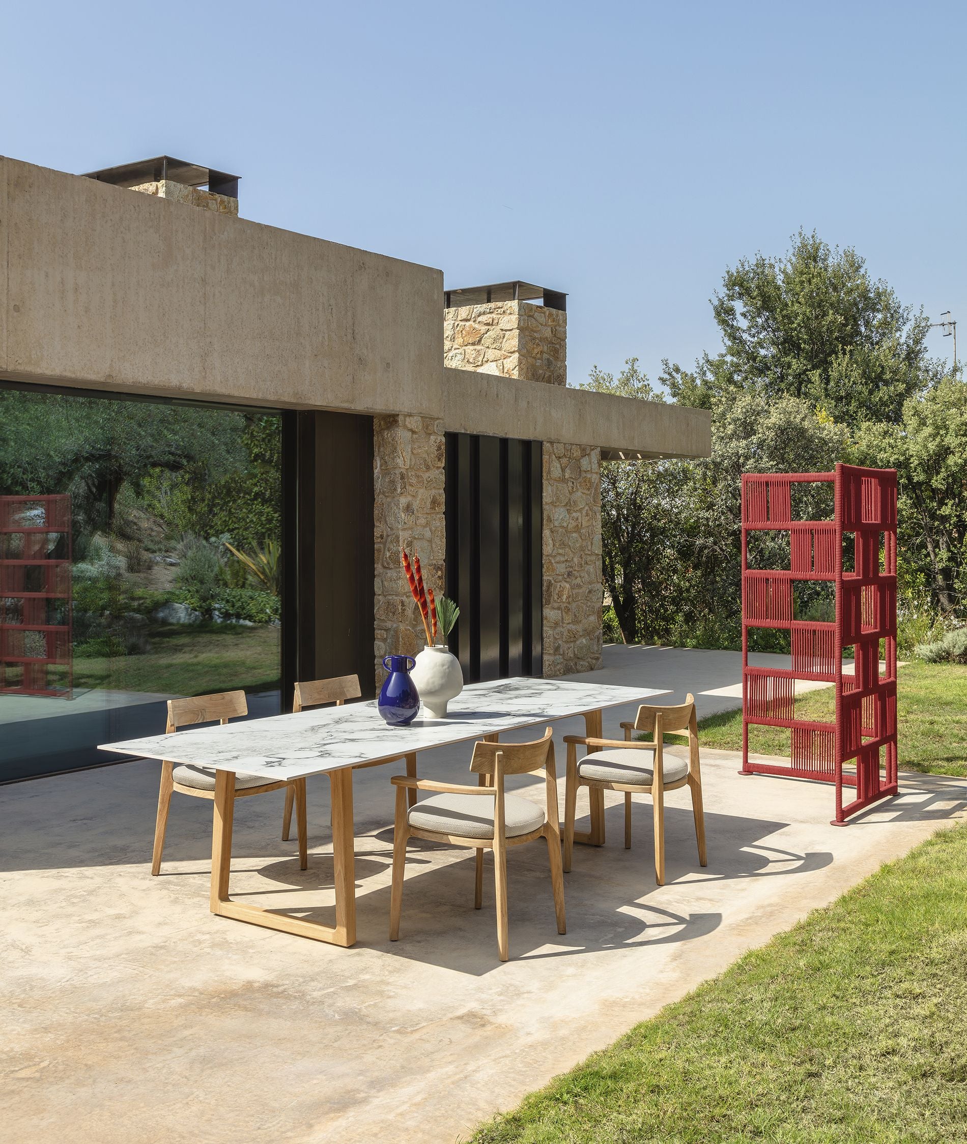 Simple in its composition, the Ever dining chair features a solid wooden frame, softened by the soft lines of its design. The cushions lend an iconic aesthetic to the piece, offering comfortable and welcoming seating. The textures of the materials, combined with the minimalist design, make it the perfect furnishing element for outdoor living.