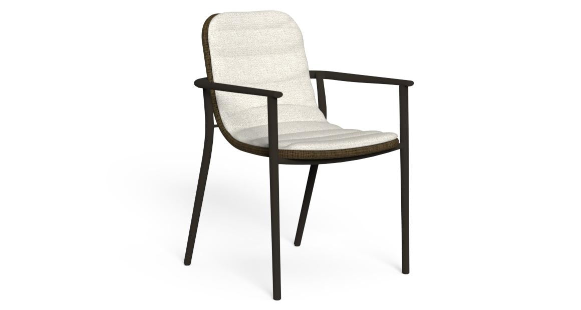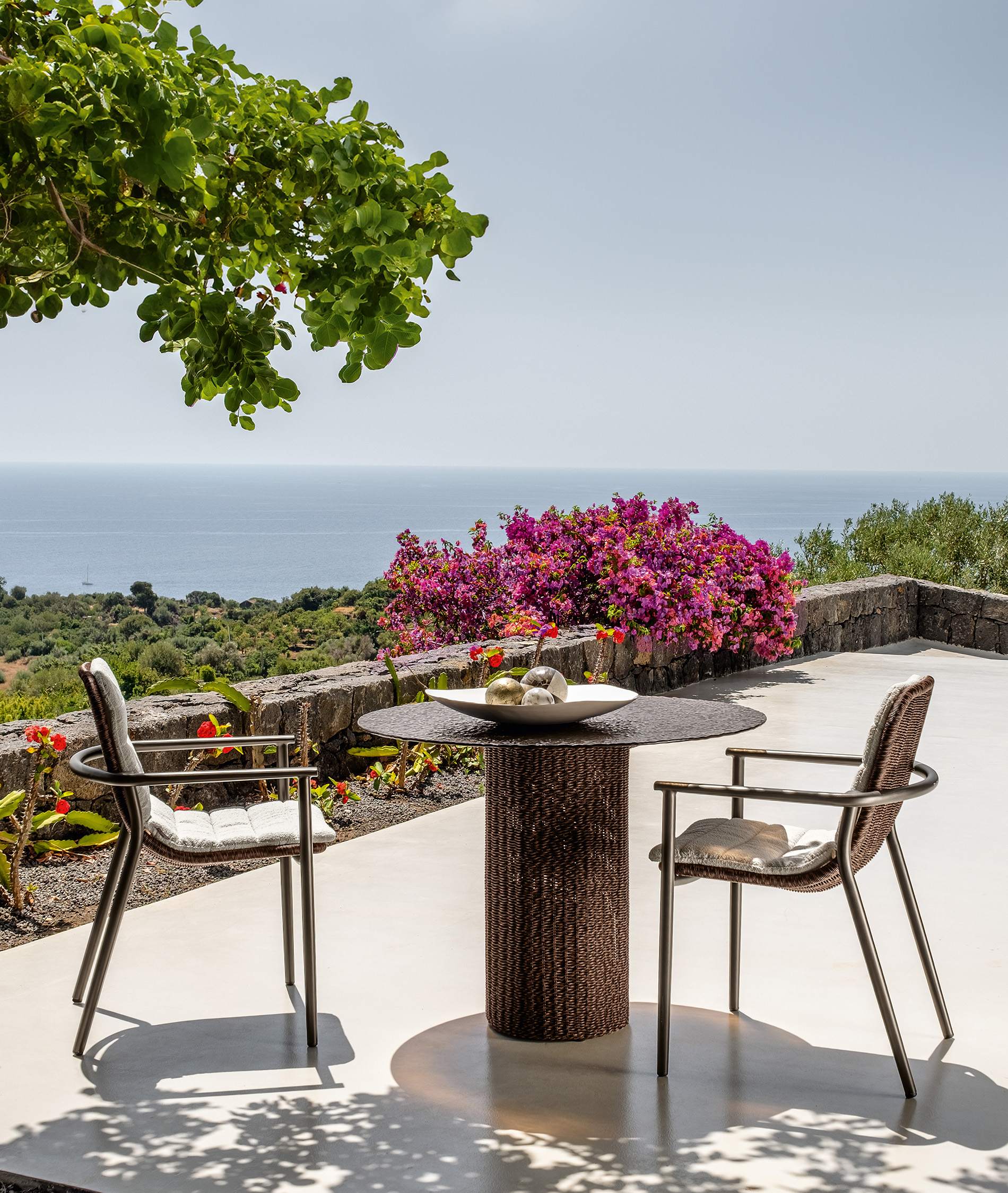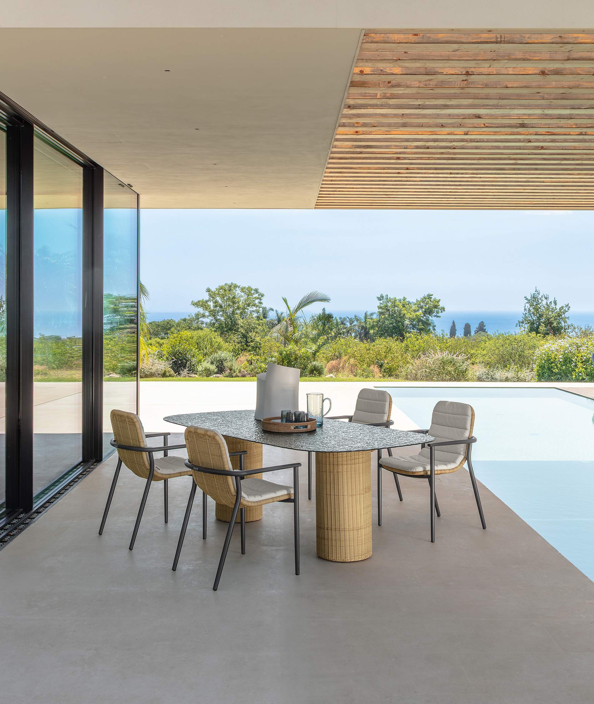 La poltrona pranzo Bond unisce leggerezza visiva e comfort funzionale. La struttura in alluminio, raffinata ed essenziale, accoglie un intreccio in midollino che conferisce calore e matericità. Lo schienale ergonomico e la seduta imbottita in tessuto bouclé offrono un’esperienza di comfort prolungata, perfetta per i momenti conviviali all’aperto. Il design, lineare ma sofisticato, dialoga armoniosamente con i tavoli dining della collezione, creando un insieme coerente e di grande eleganza.